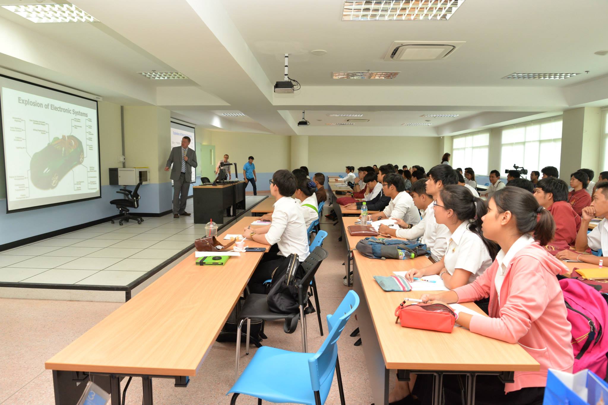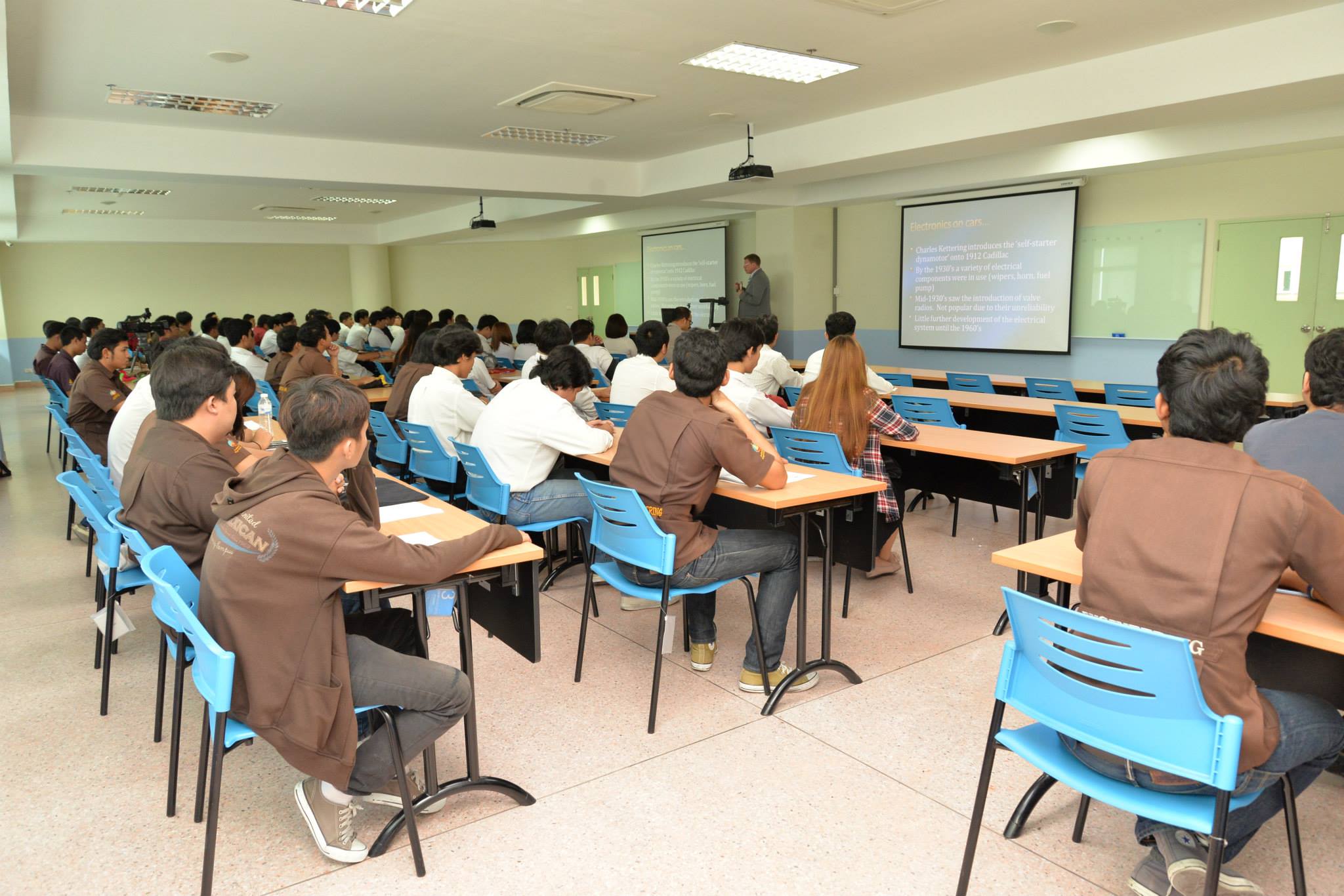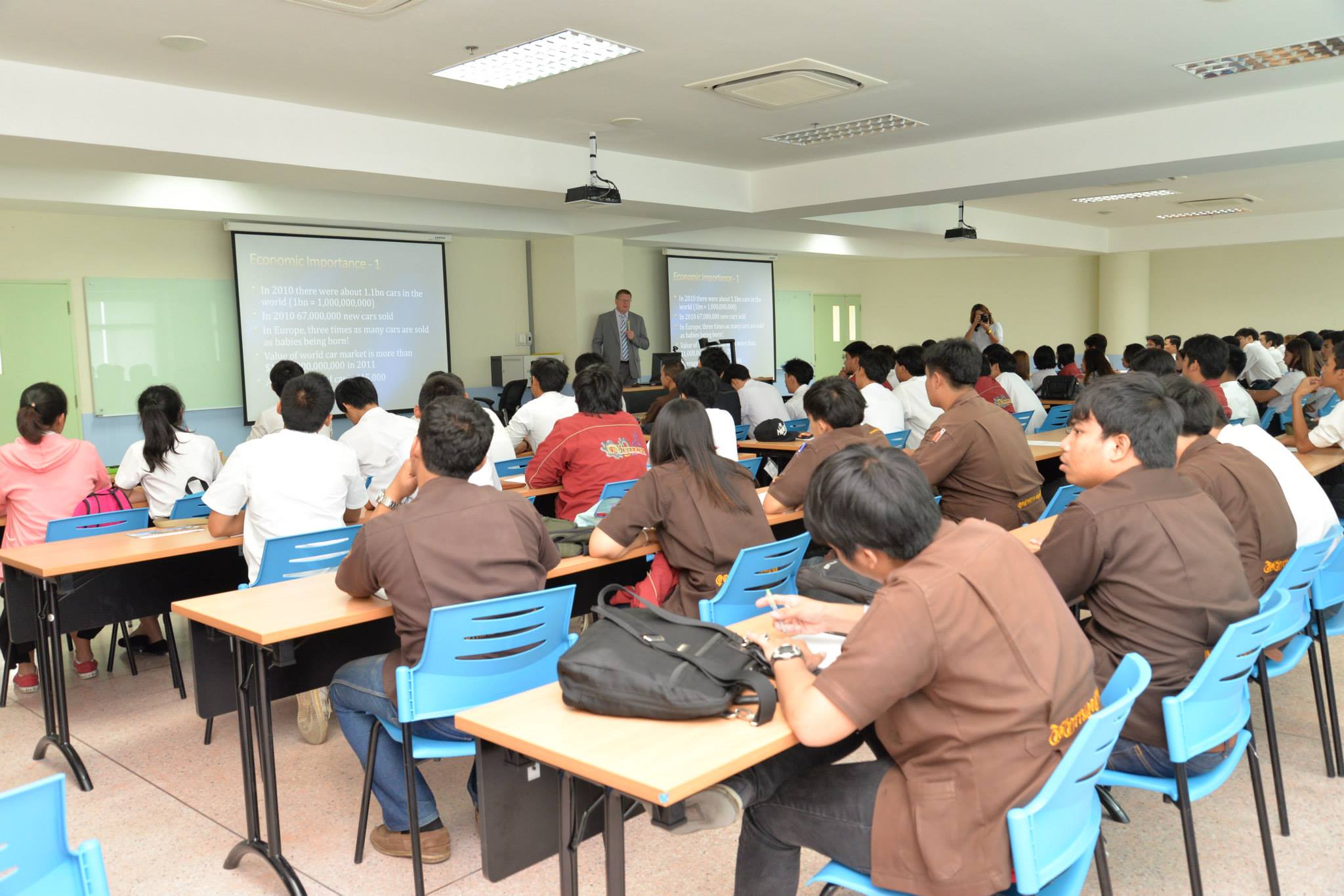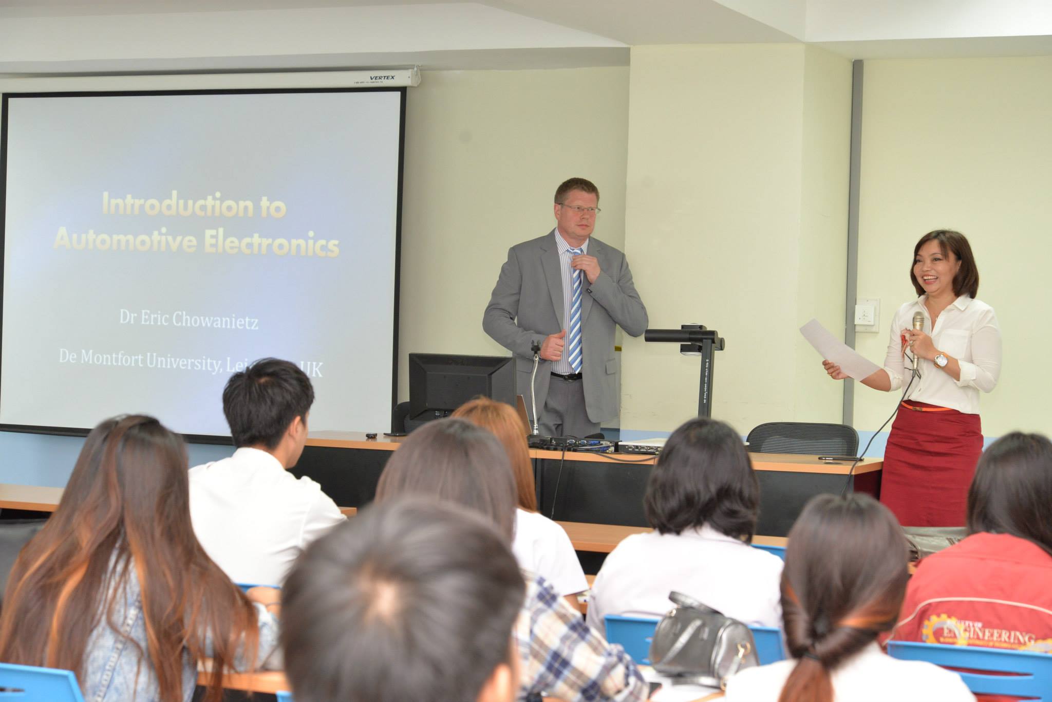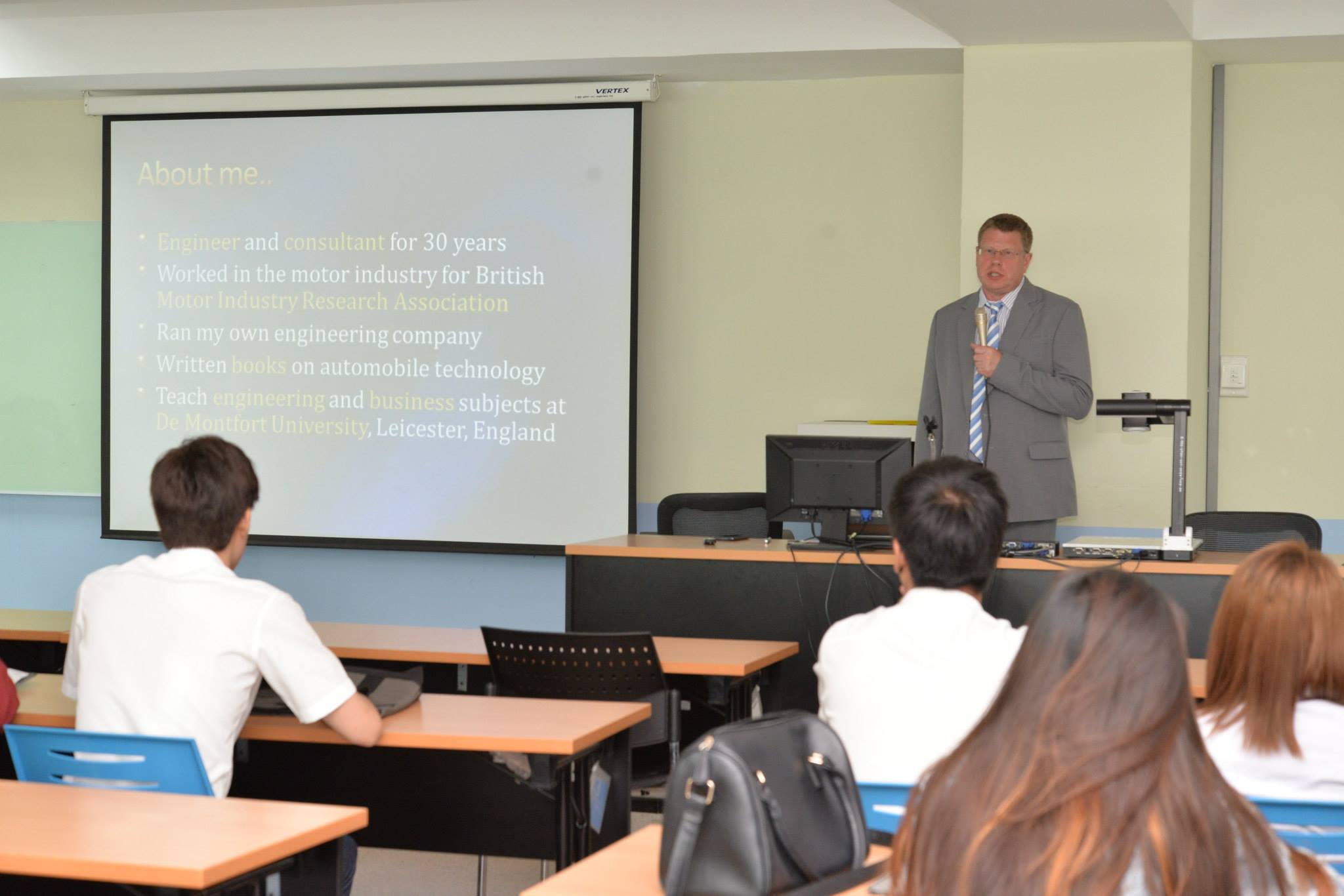 กองยุทธศาสตร์ต่างประเทศ มหาวิทยาลัยเทคโนโลยีราชมงคล ธัญบุรี โดย ผศ.ปิยนุช จริงจิตร ผู้ปฏิบัติราชการแทนผู้อำนวยการกองยุทธศาสตร์ต่างประเทศ เป็นประธานกล่าวต้อนรับ Dr.Eric Chowanietz อาจารย์จาก De Montfort University สหราชอาณาจักร มาบรรยายพิเศษในหัวข้อ Automotive ECS and Mini Anatomy ให้กับนักศึกษาของมหาวิทยาลัยเทคโนโลยีราชมงคลธัญบุรี ณ ห้อง 1207 อาคารเรียนรวมและปฏิบัติการ มหาวิทยาลัยเทคโนโลยีราชมงคลธัญบุรี เมื่อวันศุกร์ที่ 28 สิงหาคม พ.ศ. 2558