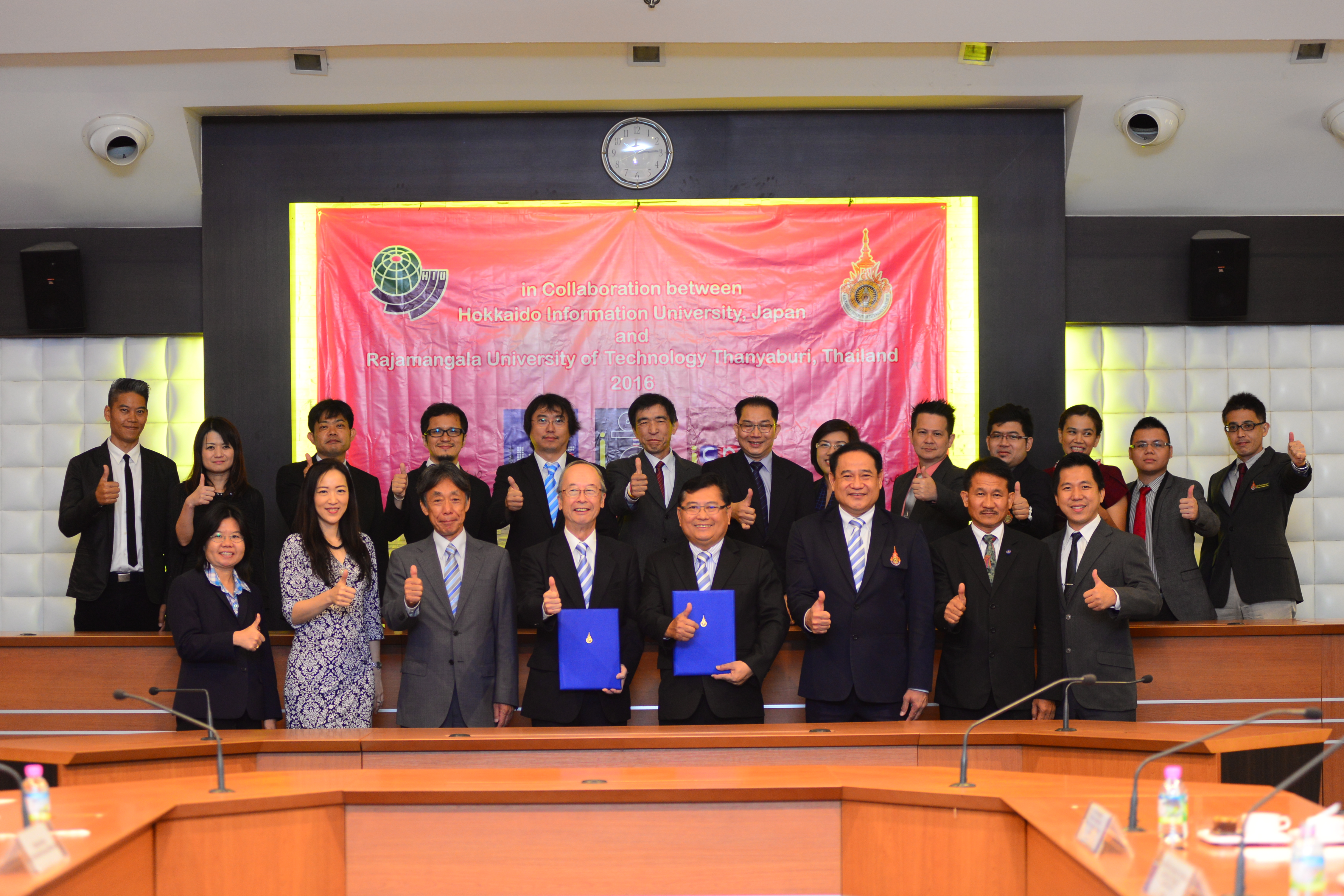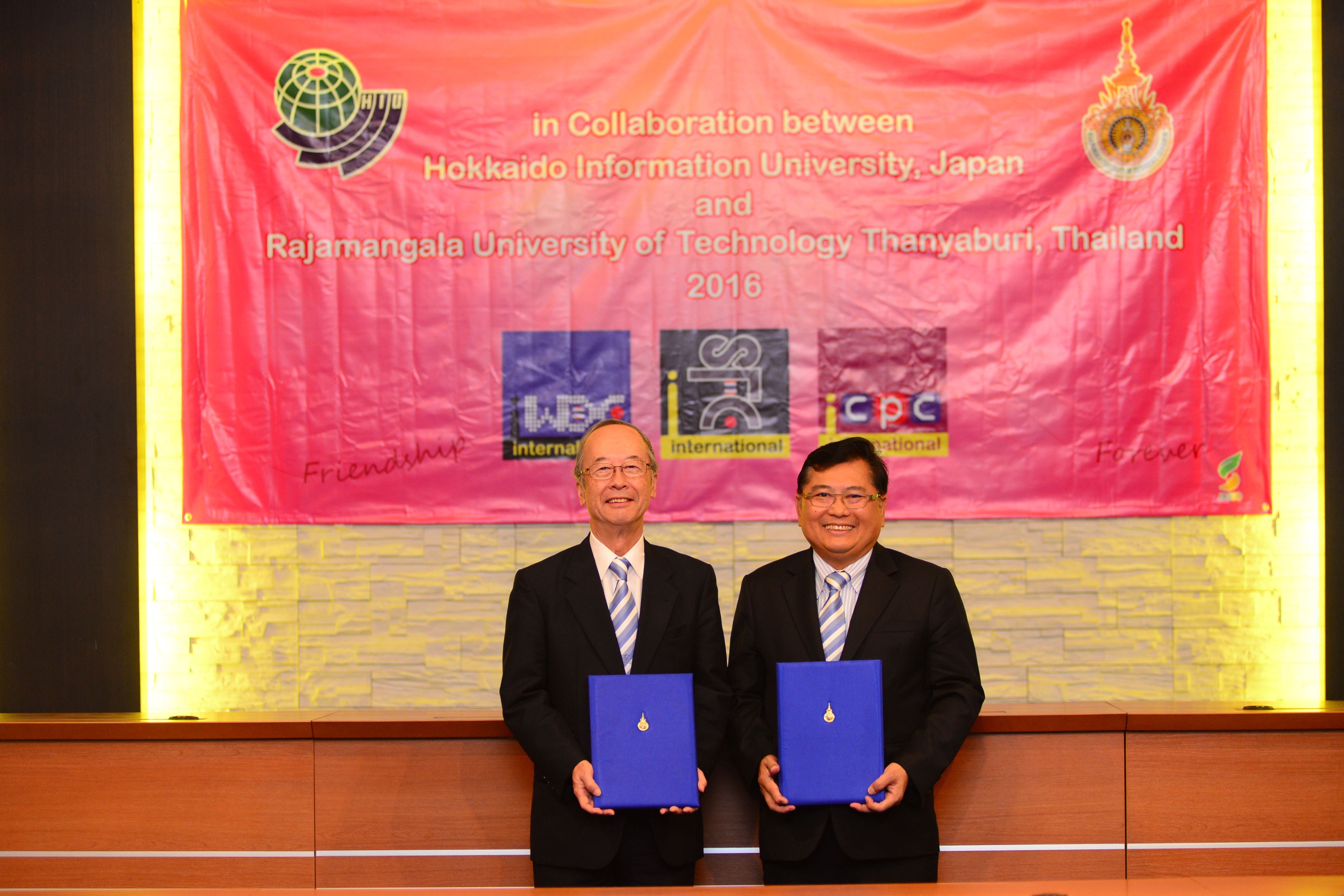 รศ.ดร.ประเสริฐ ปิ่นปฐมรัฐ อธิการบดีมหาวิทยาลัยเทคโนโลยีราชมงคลธัญบุรี และ Prof. Dr. Takashi Fuji, President of Hokkaido Information University เข้าร่วมในพิธีลงนามบันทึกความเข้าใจ (MOU) บันทึกความร่วมมือทางวิชาการ (MOA) “Joint Undergraduate Education Program” และบันทึกความร่วมมือทางวิชาการ (MOA) “International Web Design Contest (iWDC), International Short Films Contest (iSFC), International Computer Programming Contest (iCPC)” ระหว่าง มหาวิทยาลัยเทคโนโลยีราชมงคลธัญบุรี กับ Hokkaido Information University (HIU) เมื่อวันที่ 13 กันยายน 2559 เวลา 09.00 – 10.30 น. ณ ห้องประชุมมังคลอุบล ชั้น 1 อาคารเฉลิมพระเกียรติ 48 พระชันษา สมเด็จพระเทพรัตนราชสุดาฯ สยามบรมราชกุมารี