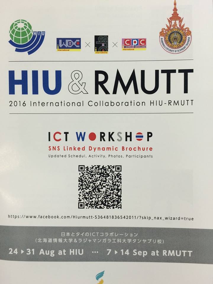 รศ.ดร. ณฐา คุปตัษเฐียร ผู้ช่วยอธิการบดี และผู้อำนวยการกองยุทธศาสตร์ต่างประเทศ พร้อมด้วยคณาจารย์ และนักศึกษา ของ มทร. ธัญบุรี ได้เข้าร่วมพิธีเปิดโครงการอบรมเชิงปฏิบัติการออกแบบเว็บไซต์ ภาพยนตร์สั้น และโปรแกรมคอมพิวเตอร์ ประจำปี 2559 (ภายใต้ความร่วมมือทางวิชาการระหว่างมหาวิทยาลัยเทคโนโลยีราชมงคลธัญบุรี กับ Hokkaido Information University ประเทศญี่ปุ่น) ในพิธีเปิดโครงการดังกล่าวได้มีการบรรยายเกี่ยวกับประวัติความร่วมมือระหว่างสองมหาวิทยาลัย เมื่อวันที่ 24 สิงหาคม 2559 ณ Hokkaido Information University