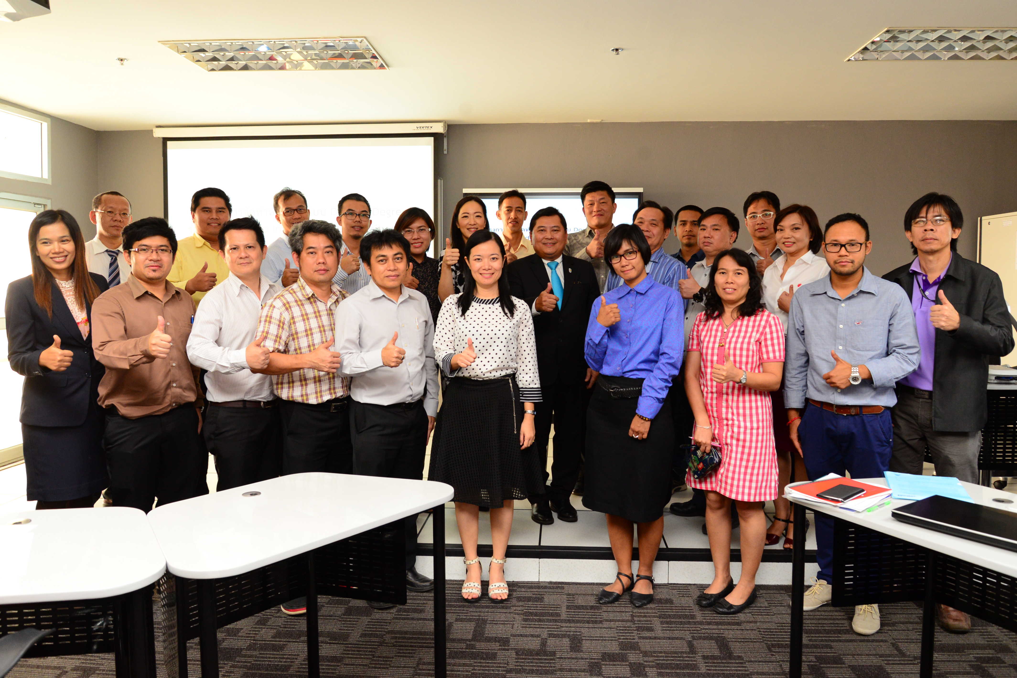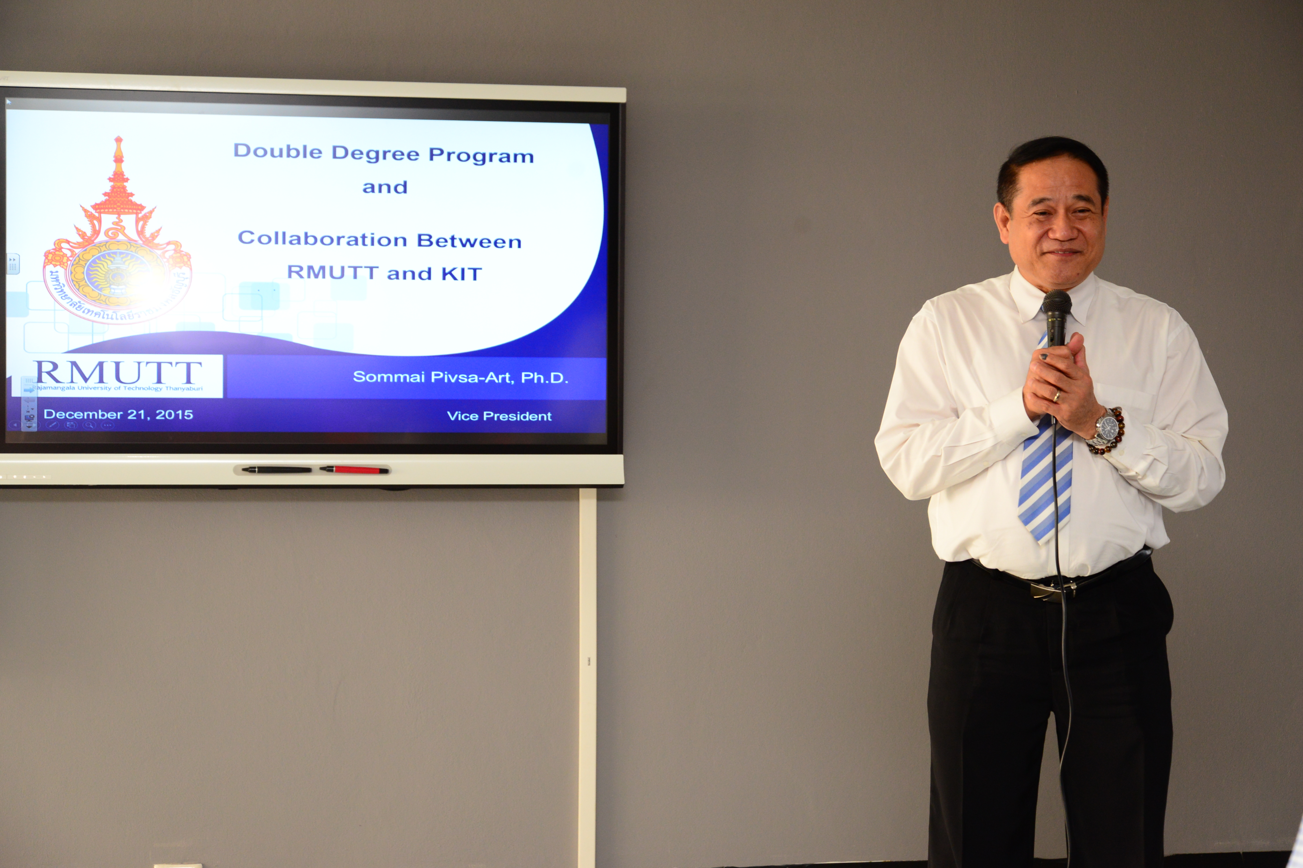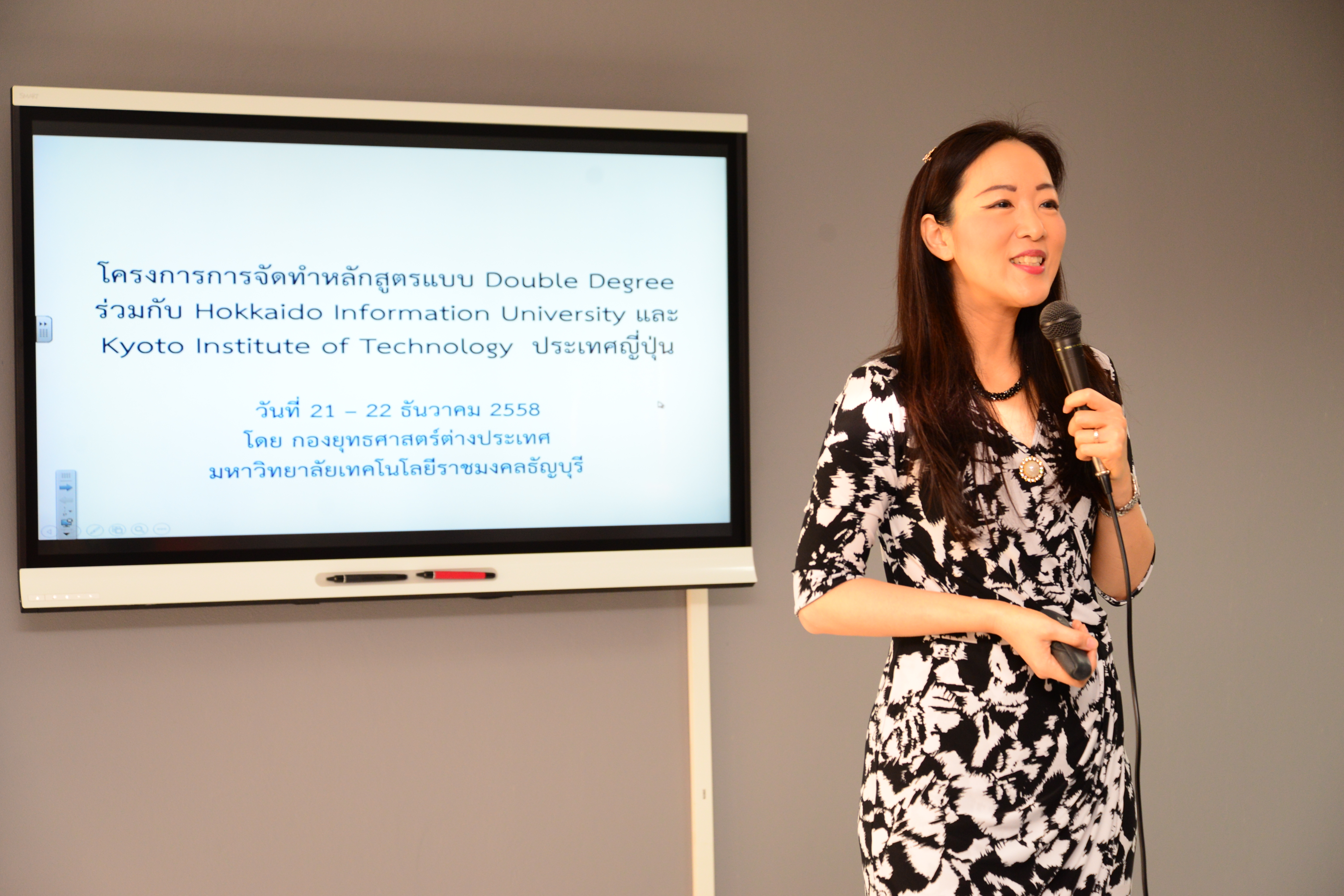 กองยุทธศาสตร์ต่างประเทศ มหาวิทยาลัยเทคโนโลยีราชมงคลธัญบุรี โดย รศ.ดร.ณฐา คุปตัษเฐียร ผู้อำนวยการกองยุทธศาสตร์ต่างประเทศ ดำเนินการจัดโครงการ การจัดทำหลักสูตรแบบ Double Degree สาขา Space Information Technology ร่วมกับ Hokkaido Information University และสาขา Textile Engineering ร่วมกับ Kyoto Institute of Technology โดยได้รับเกียรติจาก รศ.ดร.ประเสริฐ ปิ่นปฐมรัฐ อธิการบดีมหาวิทยาลัยเทคโนโลยีราชมงคลธัญบุรี เป็นประธานพิธีเปิดโครงการ พร้อมด้วย ผศ.ดร.สมหมาย ผิวสอาด ฝ่ายวิชาการและวิจัย ณ ห้อง Professional Training Center ชั้น 6 อาคารเฉลิมพระเกียรติ 48 พระชันษา สมเด็จพระเทพรัตนราชสุดาฯ สยามบรมราชกุมารี ระหว่างวันที่ 21 – 22 ธันวาคม พ.ศ. 2558 เวลา 9.00 น.